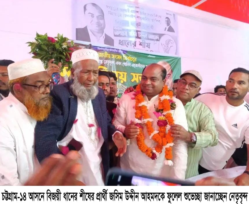 এ সময় বিজয়ী প্রার্থী জসিম উদ্দীন আহমেদ আল্লাহর প্রতি শোকরিয়া আদায় করে চন্দনাইশ ও সাতকানিয়া (আংশিক) এলাকার মানুষের প্রতি কৃতজ্ঞতা প্রকাশ করে সমৃদ্ধ চট্টগ্রাম-১৪ বিনির্মাণে সকলের সহযোগিতা ও দোয়া কামনা করেন। তিনি বলেন, এ বিজয় আপনাদের, এ নির্বাচনের প্রকৃত আয়োজক দেশের সাধারণ মানুষ। দেশ নায়ক তারেক রহমানের ৩১ দফা বাস্তবায়নে নতুন বাংলাদেশ বিনির্মাণে ঐতিহাসিক বিজয় মূলত জনগণেরই। শহীদ রাষ্ট্রপতি জিয়াউর রহমান এবং মাদার অব ডেমোক্রেস্থি দেশনেত্রী খালেদা জিয়ার প্রতি উৎসর্গ করে বিএনপির চেয়ারম্যান তারেক রহমানের আদর্শ অনুসরণ করে দেশ ও মানুষের কল্যাণে একনিষ্ঠভাবে কাজ করার প্রত্যয় ব্যক্ত করেন তিনি। তিনি বলেন, তাঁর বাড়ী চট্টগ্রাম-১৪ আসনের মানুষের জন্য সব সময় উম্মুক্ত থাকবে। বিগত সময়ে যে সকল রাজনৈতিক হয়রানি মূলক মামলা হয়েছে তা প্রত্যাহার করা হবে। বালু মহল সেন্টিকেট ভেঙ্গে দিয়ে নিময়তান্ত্রিকভাবে ইজারা দিয়ে সরকারের রাজস্ব আদায় করা হবে। স্বাস্থ্যসেবা নিশ্চিত করতে হাসপাতাল গুলোকে নতুন আঙ্গিকে পরিকল্পনা গ্রহণ করা হবে। অবহেলিত ও পিছিয়ে পড়া জনগোষ্ঠীর উন্নয়ন, তাদের অধিকার রক্ষায় ন্যায়-নিষ্ঠার সঙ্গে দায়িত্ব পালনের অঙ্গীকার করেন। তাকে চট্টগ্রাম-১৪ আসনে বিভিন্ন স্তরের মানুষ ফুল দিয়ে শুভেচ্ছা জানানোর পাশাপাশি তাঁর প্রধান নির্বাচনী সমন্বয়ক এম.এ হাশেম রাজু’র ঐকান্তিক প্রচেষ্টার জন্য তাকেও ফুল দিয়ে অভিনন্দন জানানো হয়। গভীর রাত পর্যন্ত চলে ফুলেল শুভেচ্ছা এবং মেজবান।
