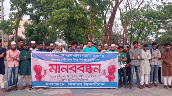 খুবি প্রতিনিধি- গাজা উপত্যকায় ফিলিস্তিনি স্বাধীনতাকামী মানুষের ওপর ইসরাইলি বাহিনীর অমানবিক ও বর্বরোচিত হামলা এবং ভারতের মুসলিমদের উপর নির্যাতনের প্রতিবাদে মানববন্ধন করেছেন খুলনা বিশ্ববিদ্যালয়ের (খুবি) শিক্ষার্থীরা। বুধবার (১৯ মার্চ) বিকেল আরো পড়ুন...